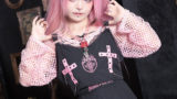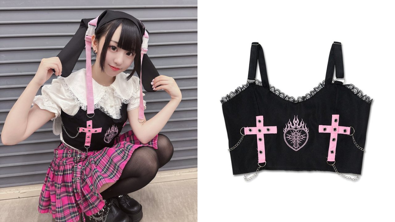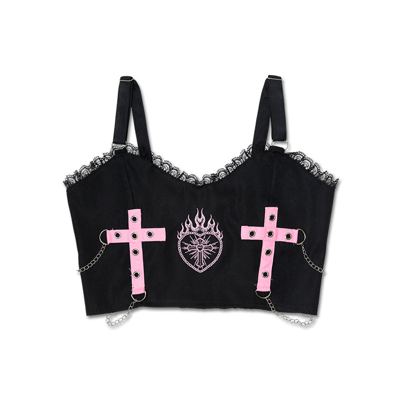 【kuua×ACDC RAGコラボアイテム♪】 病みかわイラストレーターのkuuaさんとコラボレーション♪ 天使と悪魔をコンセプトにオリジナルイラストを描きおこしていただきました! 刺繍と十字架が特徴的なビスチェ♪ ジャケットやスカートなどとセットスタイルがおすすめ◎